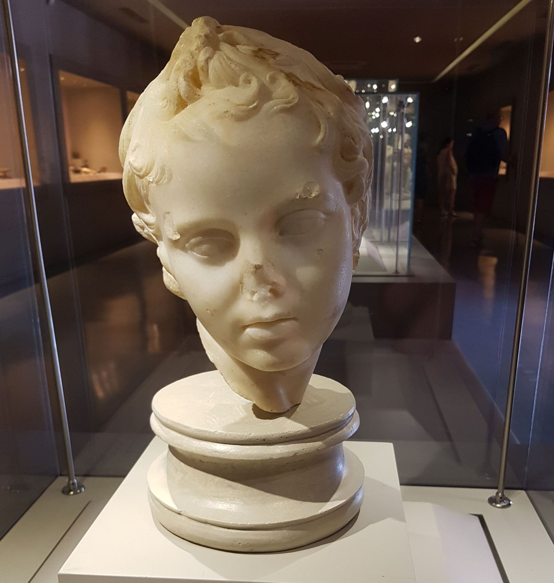 There is also a bust of Menander, a Greek dramatist and the best-known representative of Athenian New Comedy. This prolific writer composed 108 comedies but unfortunately only one of them, Dyskolos (Old Cantankerous), has survived almost entirely. Probably the best-known quotation of Menander was made by Julius Caesar when he crossed the Rubicon. According to Plutarch, the phrase used by Julius Caesar at the crossing was a quote in Greek from Menander’s play “Arrhephoros”: “He declared in Greek with a loud voice to those who were present ‘Let the die be cast’ and led the army across.”