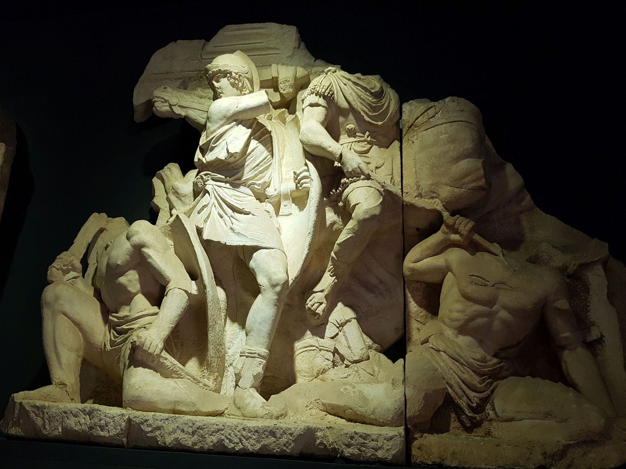 The Pollio Monument was erected adjacent to the State Agora of the city, in honour of Gaius Sextilius Polio who had made generous donations to Ephesus, including an aqueduct and a basilica. The most prominent sculpture from this location is the resting warrior from the late 1st century CE. It is a statue of a young man, depicted in a half-lying position. His left arm is leaning against a rock, and it once had supported a shield. The left leg is bent while the right leg is extended forward. The man has a calm expression of his face, and his wavy hair is secured with a band.